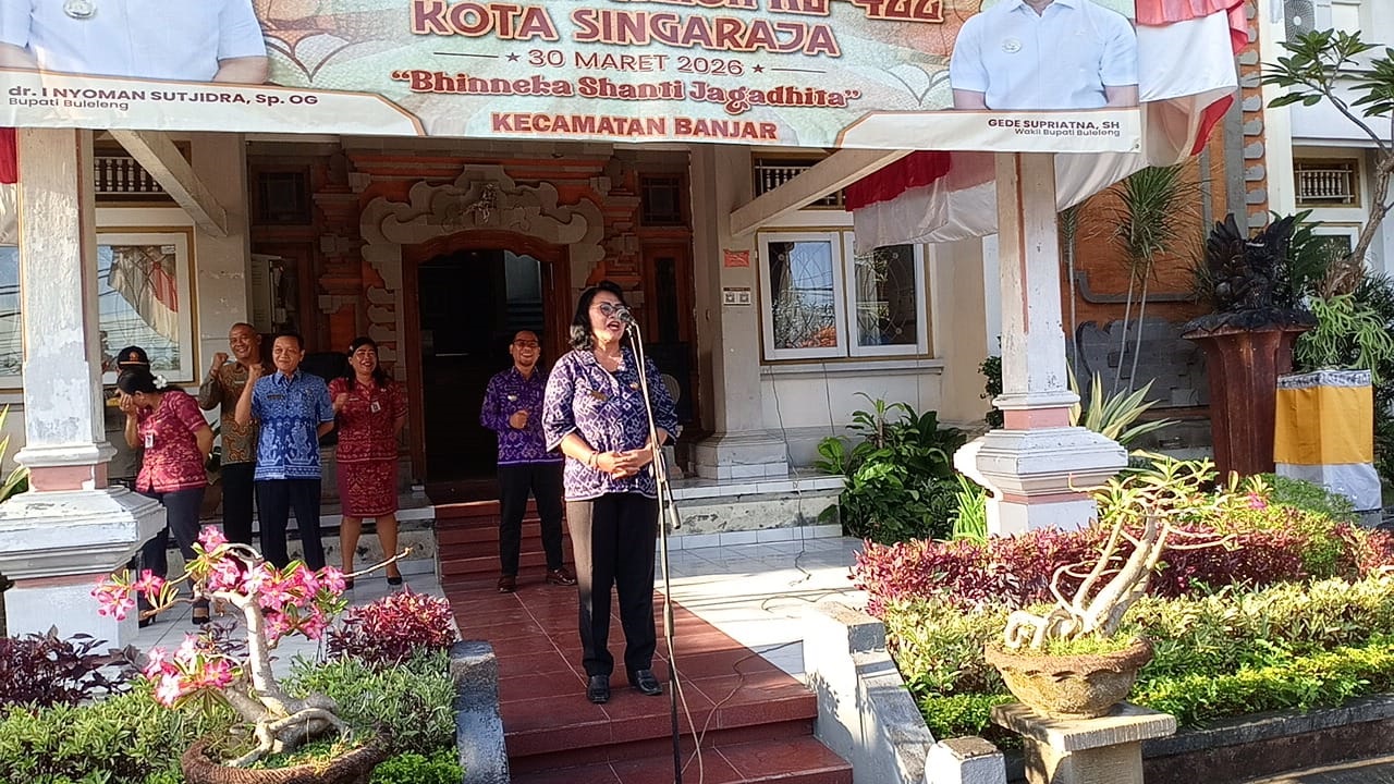 Banjar, 14 April 2026 — Apel pagi di lingkungan Kantor Camat Banjar, Selasa (14/4), dipimpin oleh Sekretaris Camat (Sekcam) Banjar, Ni Luh Srinadi Ajeng Kartini, dan diikuti oleh seluruh Aparatur Sipil Negara (ASN).