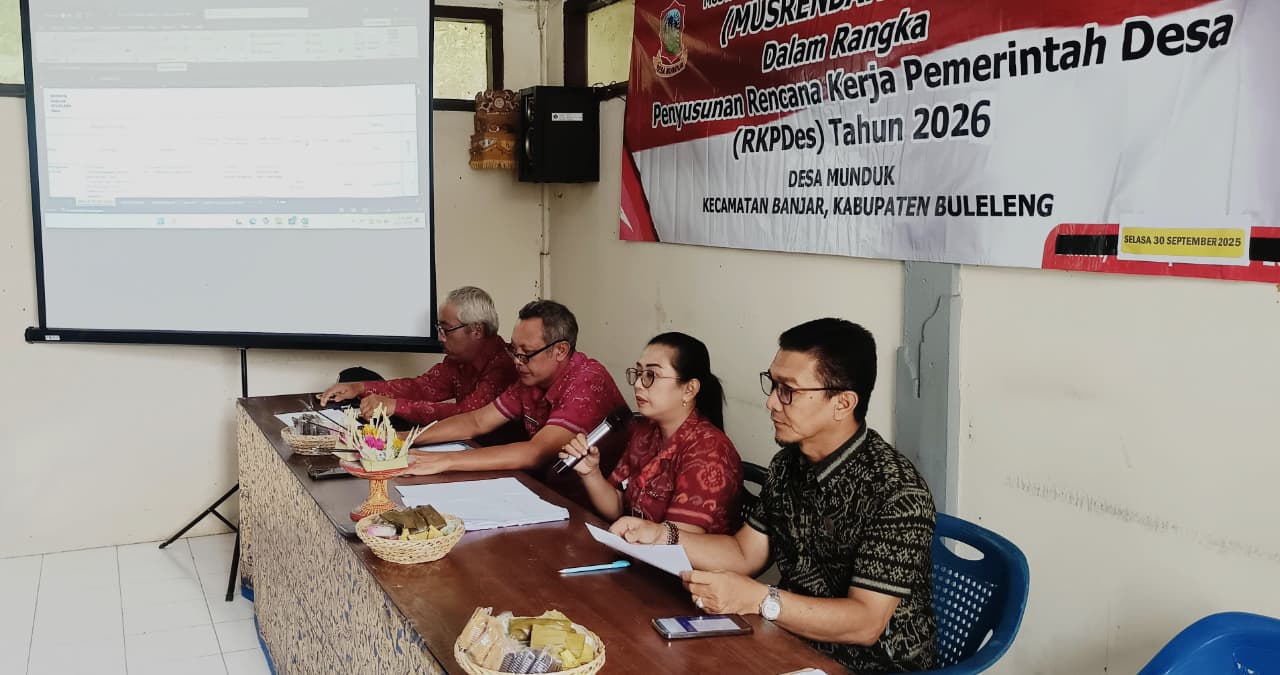 Munduk, 30 September 2025 – Pemerintah Desa Munduk menyelenggarakan Musyawarah Perencanaan Pembangunan Desa (Musrenbangdesa) sebagai langkah awal penyusunan Rencana Kerja Pemerintah Desa (RKPDes) Tahun 2026 serta daftar usulan prioritas (DU RKPDes) Tahun 2027. Kegiatan yang berlangsung di Balai Desa Munduk ini dihadiri oleh Perbekel beserta perangkat desa, Ketua dan anggota BPD, Bendesa Adat, Pengurus KDMP, Direktur BUMDes, pengurus PKK, Ketua Linmas, perwakilan PHDI dan WHDI, KPM, PLKB, PLD, LPM, kader Posyandu, Kelian Subak, Tim Penyusun dan Verifikasi RKPDes, kepala sekolah TK dan SD 1 sampai 6 Munduk, Gapoktan, Ketua Karang Taruna, Pokdarwis, serta tokoh masyarakat.