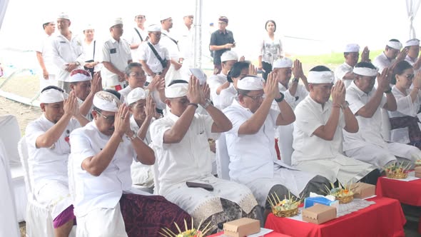 Sebelum prosesi peletakan batu pertama dilakukan, kegiatan diawali dengan persembahyangan bersama, dilanjutkan dengan upacara ngeruwak dan mecaru sebagai bentuk permohonan doa agar proses pengerjaan berjalan lancar dan selesai tepat waktu.