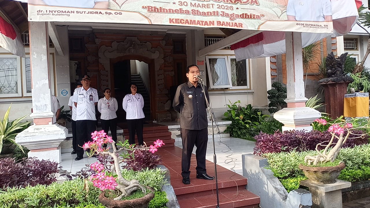 Banjar - Camat Banjar memimpin apel pagi yang diikuti oleh seluruh jajaran pegawai di lingkungan Kecamatan Banjar setelah pelaksanaan libur Hari Raya Nyepi dan Idul Fitri. Apel pagi ini menjadi momentum untuk memperkuat kembali kedisiplinan, semangat kerja, serta koordinasi antar perangkat daerah setelah menjalani masa libur panjang, Senin (25/3/2026).