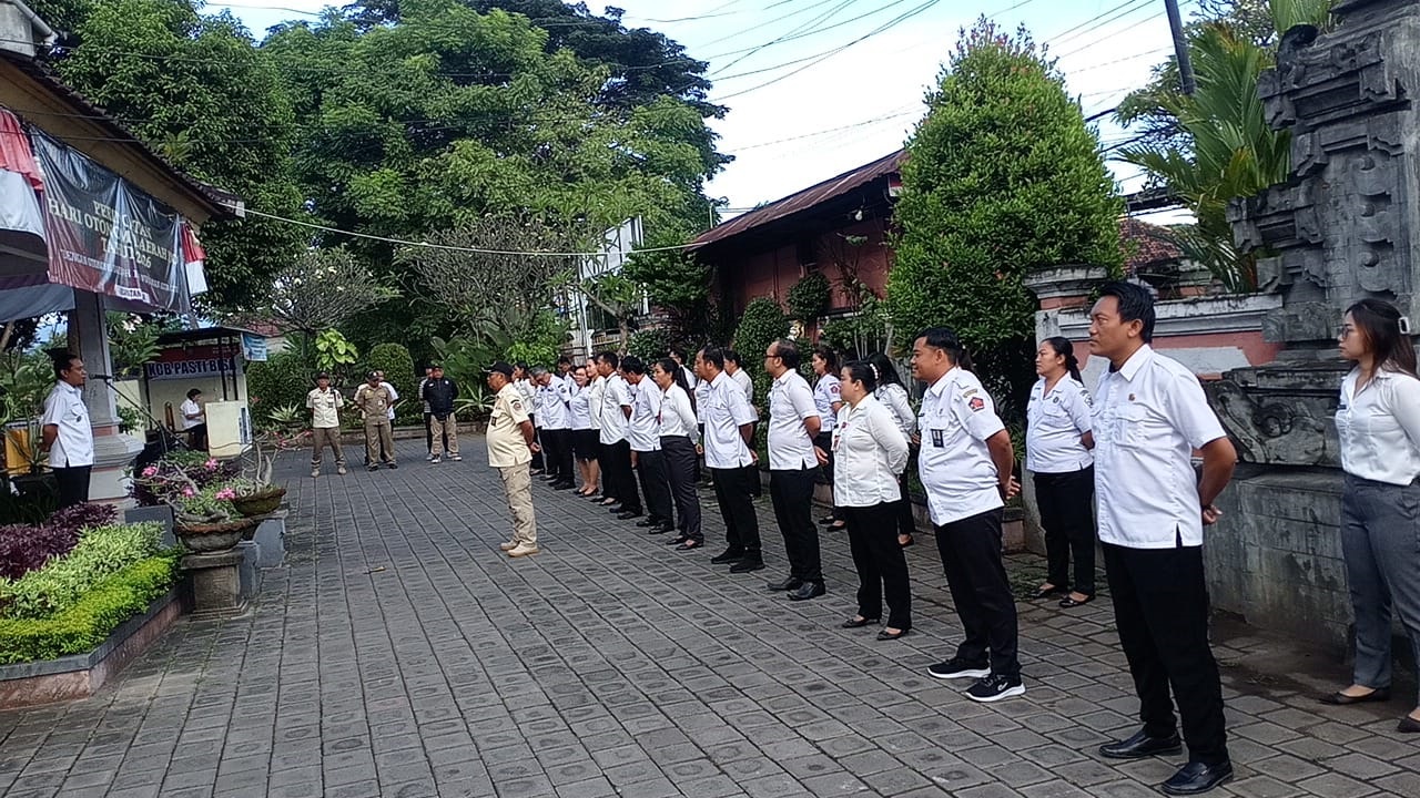 Banjar, 29 April 2026 – Camat Banjar Putu Widiawan memimpin apel pagi yang dilaksanakan di lingkungan Kantor Camat Banjar, Rabu (29/4). Kegiatan tersebut diikuti seluruh Aparatur Sipil Negara (ASN) lingkup Kantor Camat Banjar sebagai bagian dari rutinitas pembinaan disiplin dan koordinasi kerja.