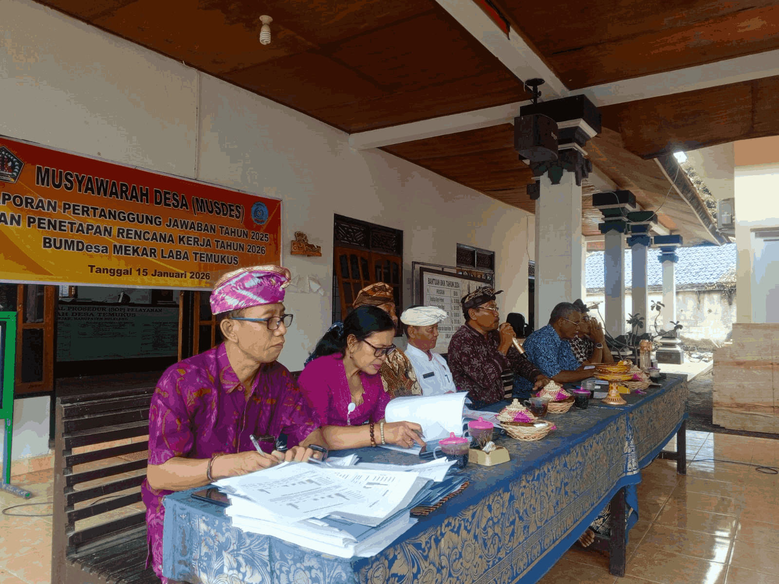 Kegiatan Musdes dibuka secara resmi oleh Ketua BPD Desa Temukus, kemudian dilanjutkan dengan sambutan dari Perbekel Desa Temukus. Agenda utama Musdes berupa penyampaian Laporan Pertanggungjawaban oleh Direktur BUMDes Mekar Laba yang memaparkan kinerja, pengelolaan usaha, serta capaian BUMDes selama tahun berjalan.